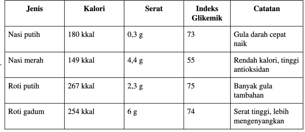Nasi merah unggul untuk mereka yang butuh energi tapi ingin menjaga gula darah tetap stabil. Sementara roti gandum lebih ideal bagi yang ingin menjaga rasa kenyang lebih lama.
